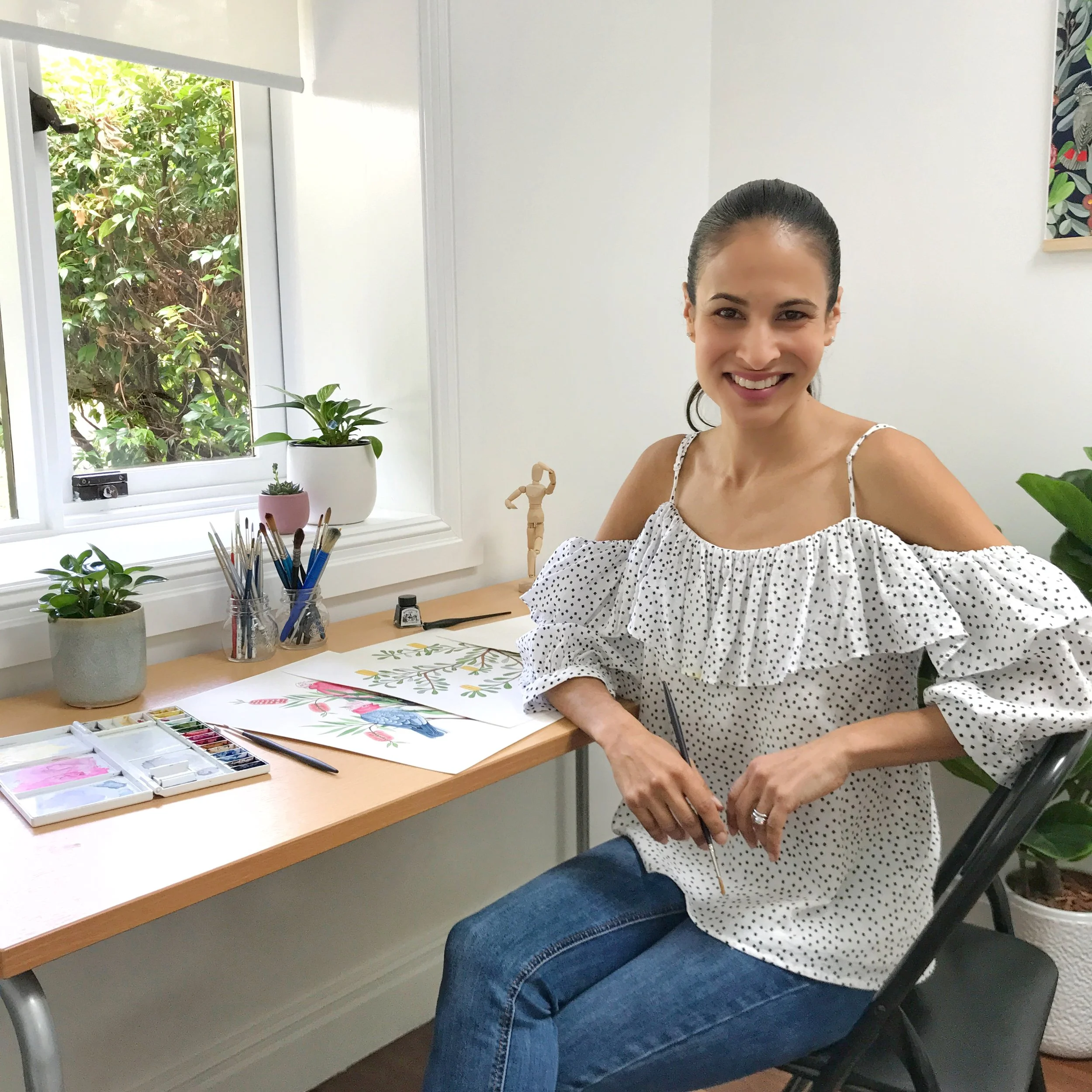 I am an illustrator and printmaker and the main genre I explore is Australian native flora and fauna. I work mainly with watercolour and ink. I study my subject in as much detail as I can before starting on the final artwork. I start by sketching my subject and then add definition with ink, followed by adding colour with watercolour. I use watercolour in a very controlled manner, to add depth and dimensionality to my illustrations. My illustrations are generally bold in colour and have a playful feel. I illustrate each element separately and then use photoshop to complete the composition, layering flora and fauna in a jungle-like feel.