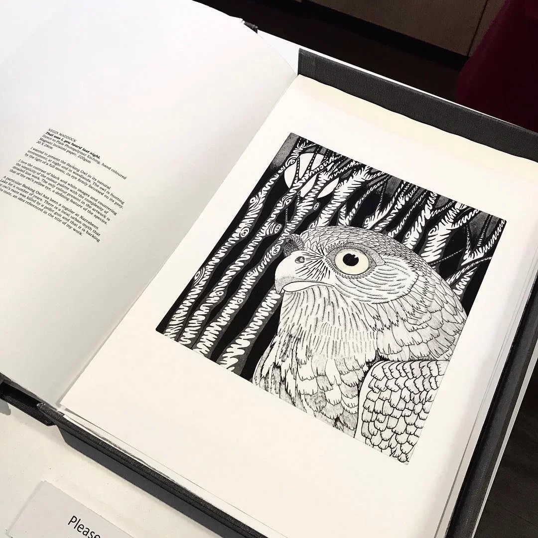 29 artists from the Warringah Printmakers Studio were involved in this project. Each artist was assigned an endangered or vulnerable species of the Northern Beaches area. My assigned species was the Barking Owl (Ninox Connivens).
