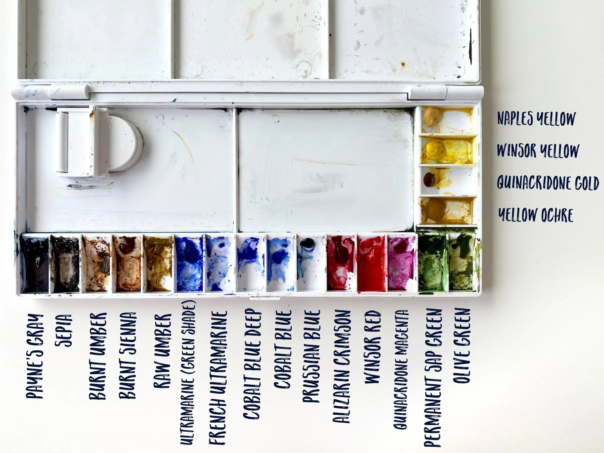I use the professional watercolour range in tubes, and use a folding plastic palette to hold my colours - due to its portability. It has 19 slanted wells that I squeeze a blob of colour in. I make sure to put the blob at the top of the “hill” so I can easily pull down small amounts of pigment into the well when needed. I also label the wells on the side of the palette with the colour that’s in it - just makes life a little easier, especially when you are first learning the different colour pigments. The flat areas of the palette are convenient for quick colour mixes, but I do most of my colour mixing on separate porcelain palettes. If you can, choose porcelain surfaces over plastic for mixing watercolours.